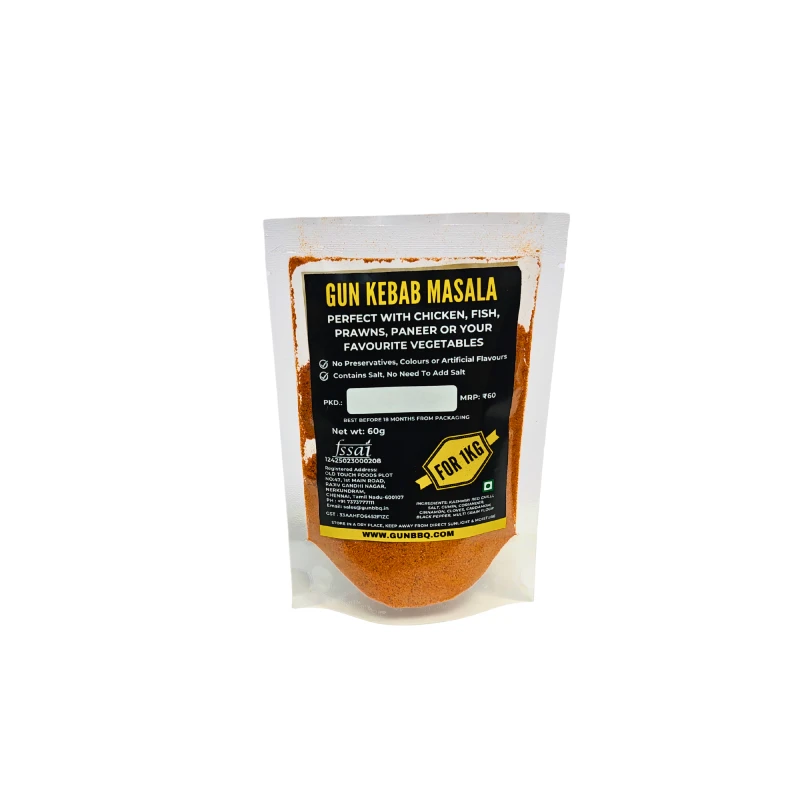 GUN KEBAB MASALA – A ready-to-cook kebab spice mix packed with authentic flavor. Just mix 1 packet with 1 kg of chicken, fish, prawns, paneer, or vegetables. Grill or shallow fry. No preservatives, colors, or artificial flavours. Salt included – no need to add!